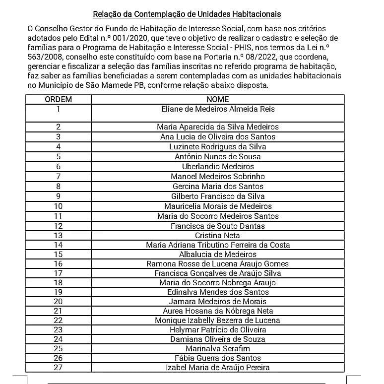 O Conselho Gestor do Fundo de Habitação de Interesse Social, com base nos critérios adotados pelo Edital n.º 001/2020, que teve o objetivo de realizar o cadastro e seleção de famílias para o Programa de Habitação e Interesse Social - PHIS, nos termos da Lei n.º 563/2008, divulga relação das famílias contempladas com as unidades habitacionais no Loteamento Jardim São Mamede.