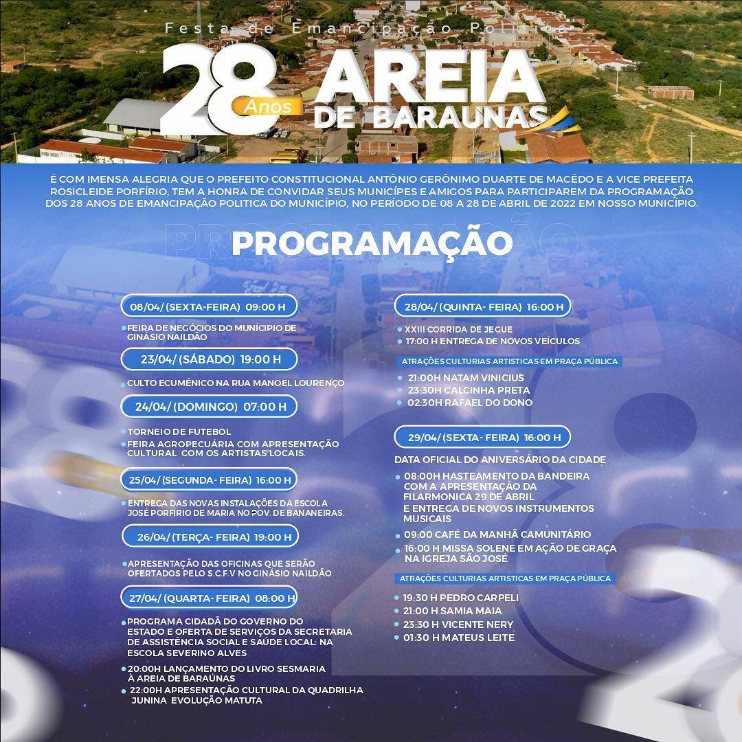 O Município de Areia de Baraúnas dá seguimento ao longo dessa semana ao desenvolvimento de diversas ações em alusão ao aniversário de 28 anos de Emancipação Política.