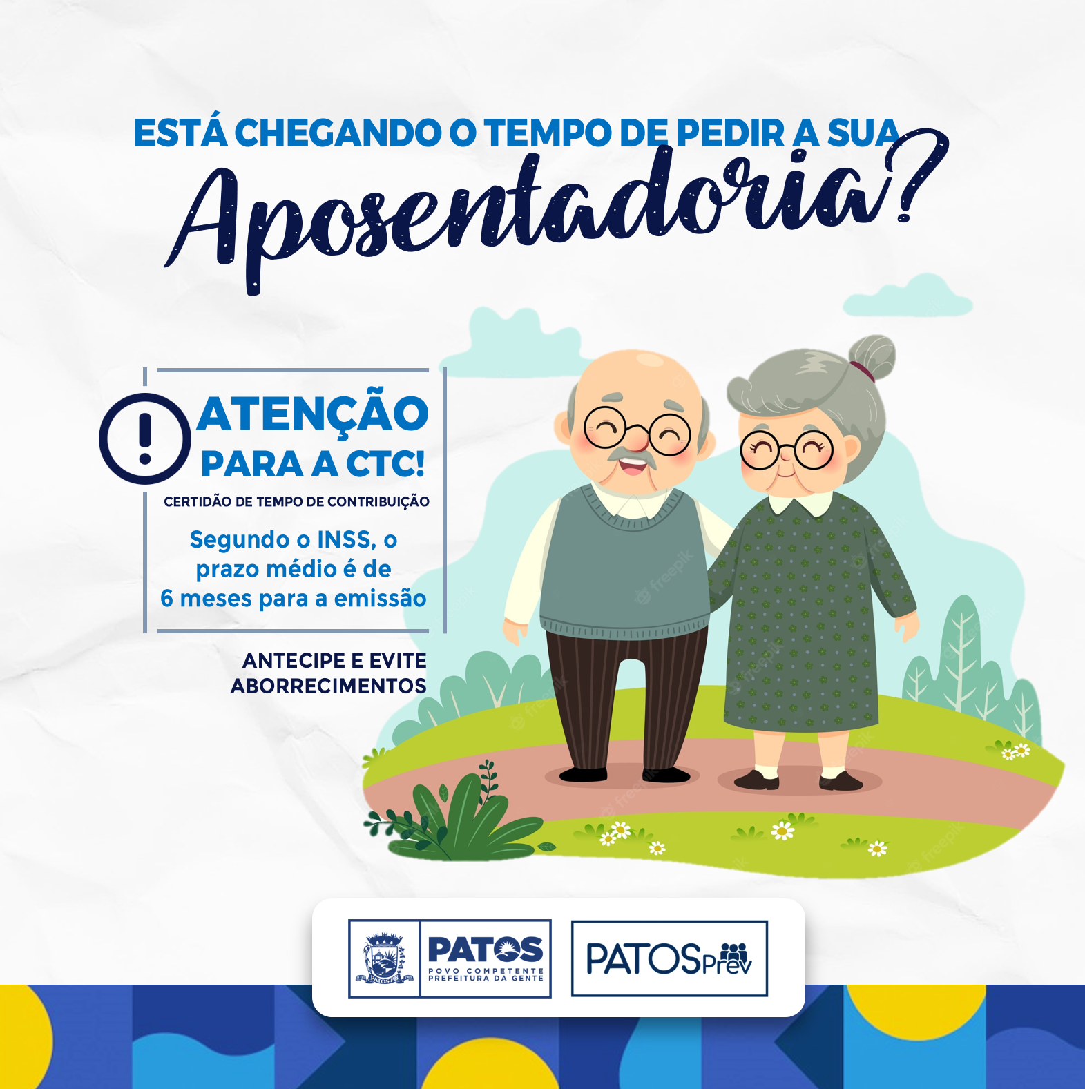 O Instituto de Seguridade Social do Município de Patos - PatosPREV - chama atenção dos servidores municipais que estão com o seu tempo de aposentadoria próximo, para solicitarem do INSS a emissão da Certidão do Tempo de Contribuição - CTC.