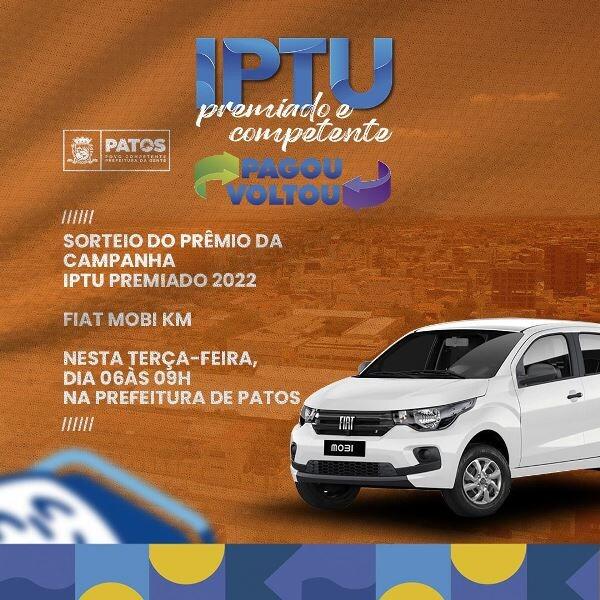 A Prefeitura de Patos realizará, nesta terça-feira, dia 06 de Setembro, o sorteio da campanha IPTU Premiado 2022. O sorteio ocorrerá às 09h, na parte externa da Prefeitura de Patos, e contará com a presença de auditores e será transmitido pelas redes sociais oficiais da Prefeitura.