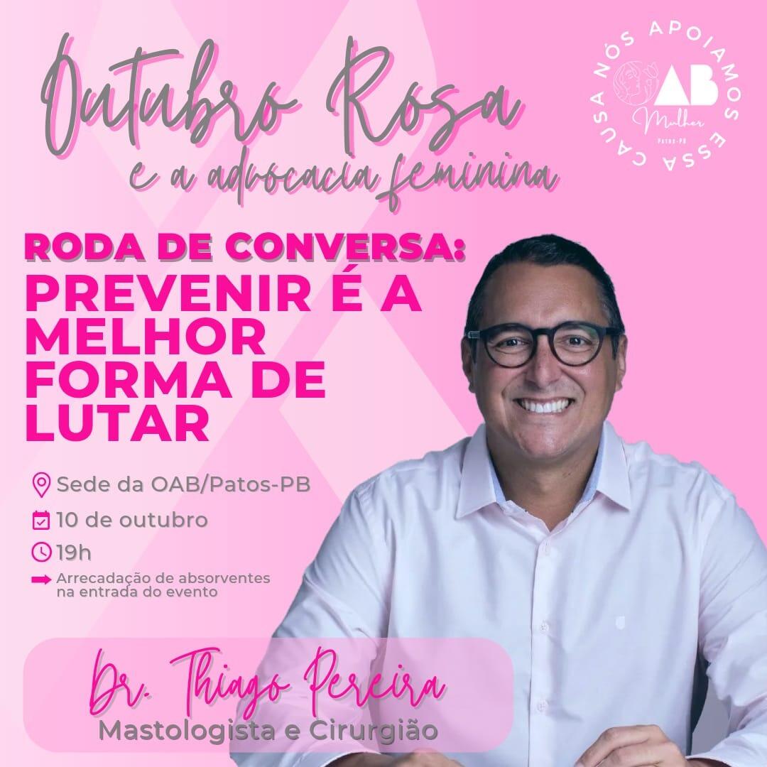 Na oportunidade, teremos uma roda de conversa com o Dr. Thiago Pereira, mastologista e cirurgião, a respeito da conscientização, prevenção e detecção precoce do câncer de mama.