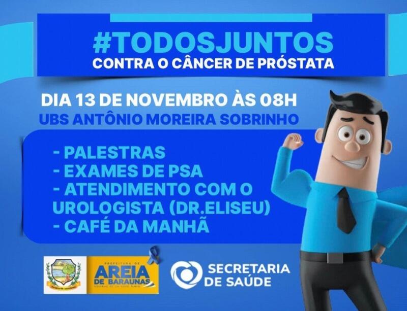 A Prefeitura de Areia de Baraúnas vai realizar, no próximo domingo (13), uma programação em alusão a Campanha 'Novembro Azul', que visa a prevenção e diagnóstico ao câncer de próstata.