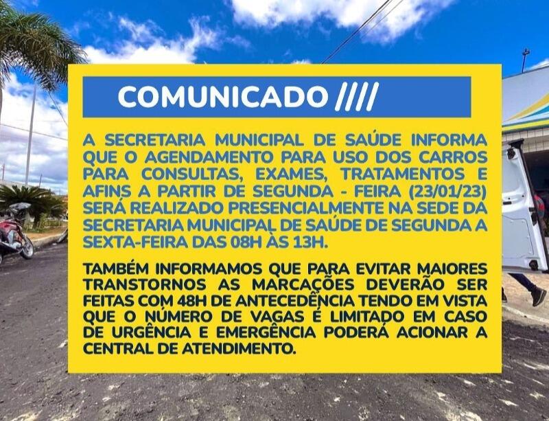 Visando atender melhor os usuários do Sistema Único de Saúde de Areia de Baraúnas, o agendamento de veículos para o transporte de pacientes em casos de consultas médicas, exames e tratamentos fora do domicílio vai ser realizado de forma presencial na sede da Secretaria de Saúde.