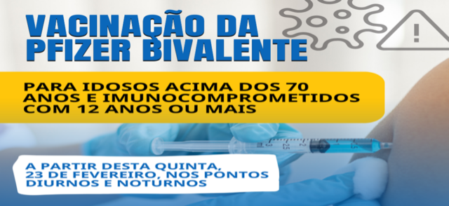 A partir desta quinta-feira (23) a Prefeitura Municipal de Patos inicia a vacinação contra Covid-19 com bivalente para idosos acima de 70 anos e também para pessoas acima de 12 anos de idade, imunocomprometidas.