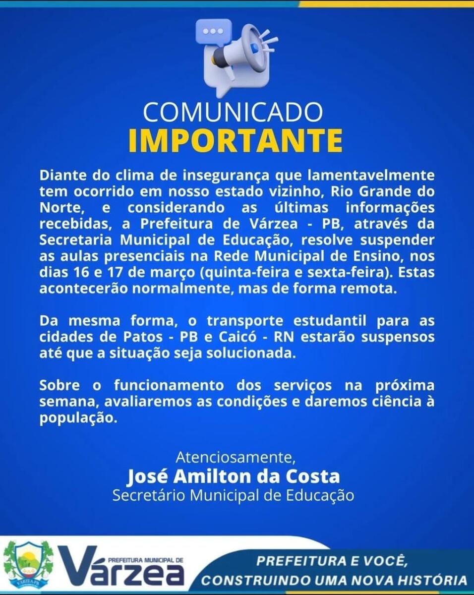 Após o registro de ataques em várias cidades do Rio Grande do Norte, estado que faz divisa com a Paraíba, a Prefeitura de Várzea, no Sertão Paraibano, suspendeu as aulas presenciais na rede municipal nesta quinta e sexta-feira (17) e também o transporte estudantil para Patos e Caicó, no RN.