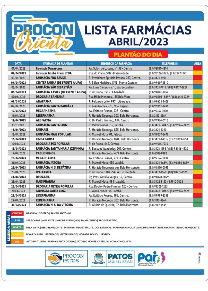 O Procon/Patos divulgou, nesta segunda-feira, dia 03 de Abril, o cronograma de farmácias que deverão atuar em formato de plantão 24 horas.