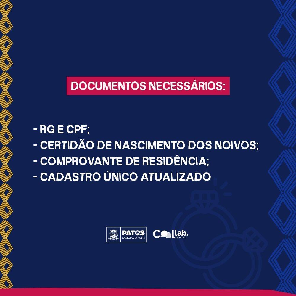A Prefeitura de Patos, por meio da Secretaria de Desenvolvimento Social, divulgou nesta terça-feira, 25, a data de inscrições do casamento coletivo no São João 2023 de Patos. Os casais interessados devem se inscrever a partir do dia 02 de maio.