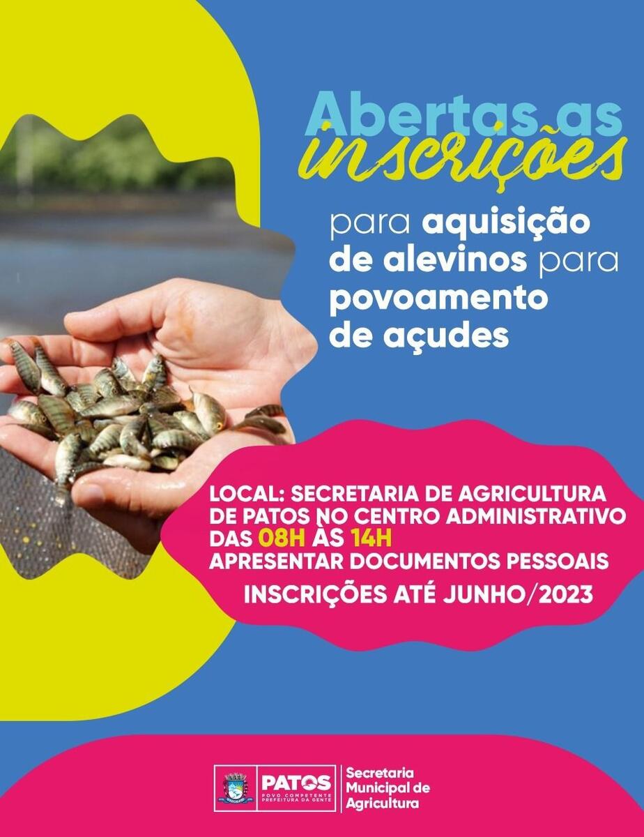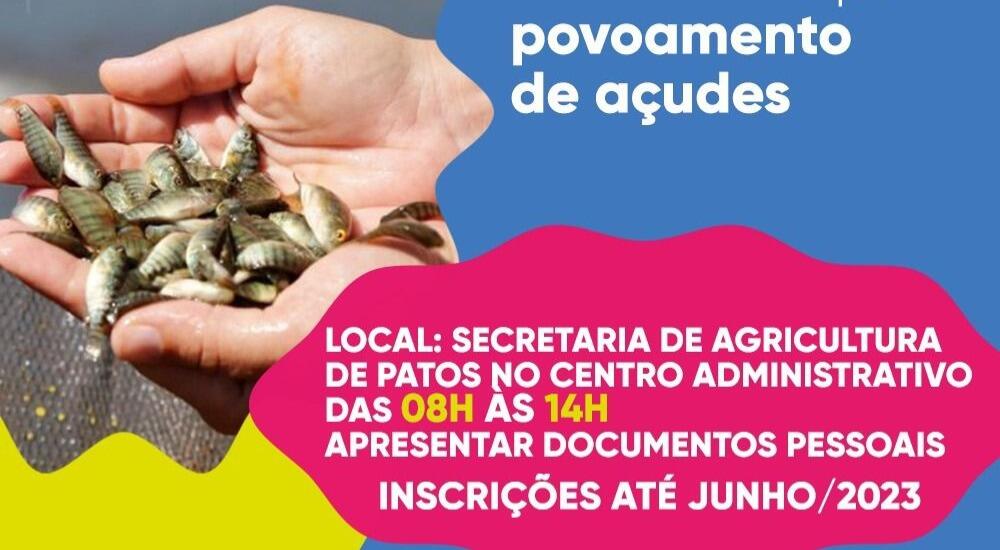 Estão abertas as inscrições para os interessados em adquirir alevinos para povoamento de açudes. O interessado deve dirigir-se à sede da Secretaria de Agricultura de Patos, até o mês de junho, munido dos documentos pessoais, das 08h às 14h.