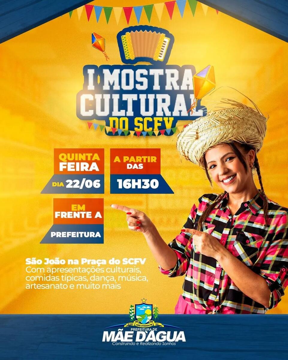 Em ritmo de São João, a Secretaria Municipal de Assistência Social de Mãe d’Água realiza nesta quinta-feira, dia 22 de junho, a I Mostra Cultural do SCFV (Serviço de Convivência e Fortalecimento de Vínculos). O evento tem início previsto para as 16h30min, no pátio em frente a Prefeitura Municipal.
