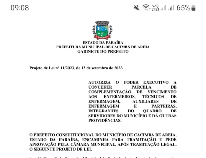 De acordo com o teor do referido projeto se aprovado, autoriza o Poder Legislativo a conceder parcela de complementação de vencimentos aos enfermeiros, técnicos de enfermagem, auxiliares de enfermagem e parteiras, integrantes do quadro de servidores do município.