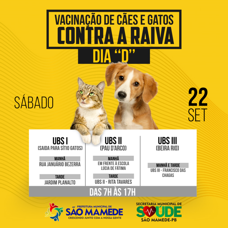 A Campanha de Vacinação contra a Raiva Animal começou nessa segunda-feira (17), na cidade de São Mamede. A Secretaria Municipal de Saúde lançou cronograma que contempla em primeiro lugar cachorros e gatos da zona rural. A área foi dividida de acordo com o setor de atuação dos Agentes Comunitários de Saúde (ACS).