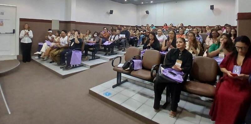 A mesa de abertura contou com a participação da secretária executiva Jéssica Oliveira, da presidenta do Conselho Municipal dos Direitos da Mulher (CMDM), Samara Oliveira, e da representante da sociedade civil Maria do Carmo Nunes Soares (Carminha Soares).