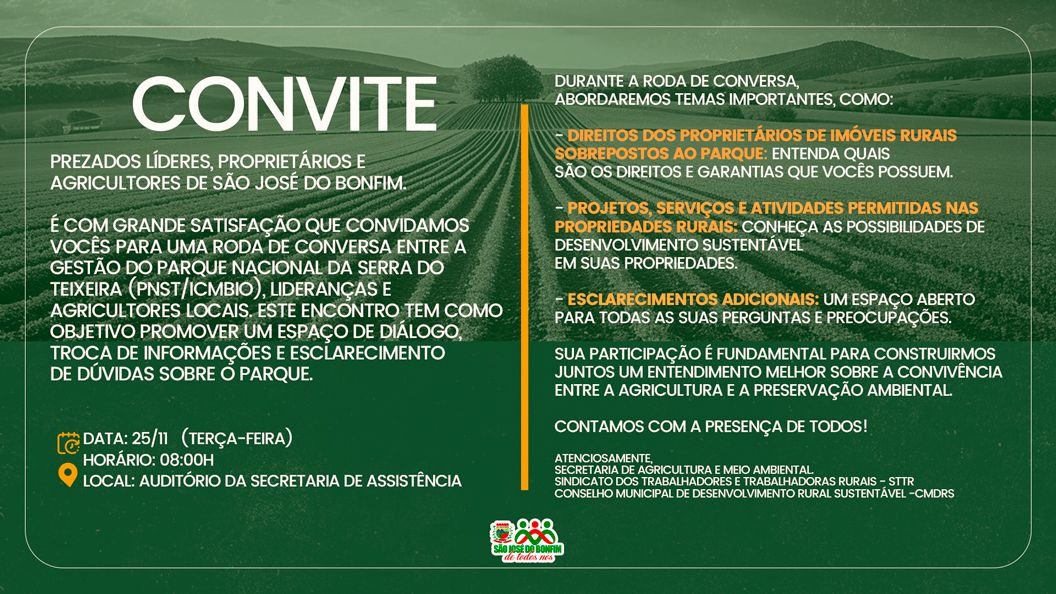É com grande satisfação que convidamos vocês para uma Roda de Conversa entre a Gestão do Parque Nacional da Serra do Teixeira (PNST/ICMBio), lideranças e agricultores locais. Este encontro tem como objetivo promover um espaço de diálogo, troca de informações e esclarecimento de dúvidas sobre o Parque.