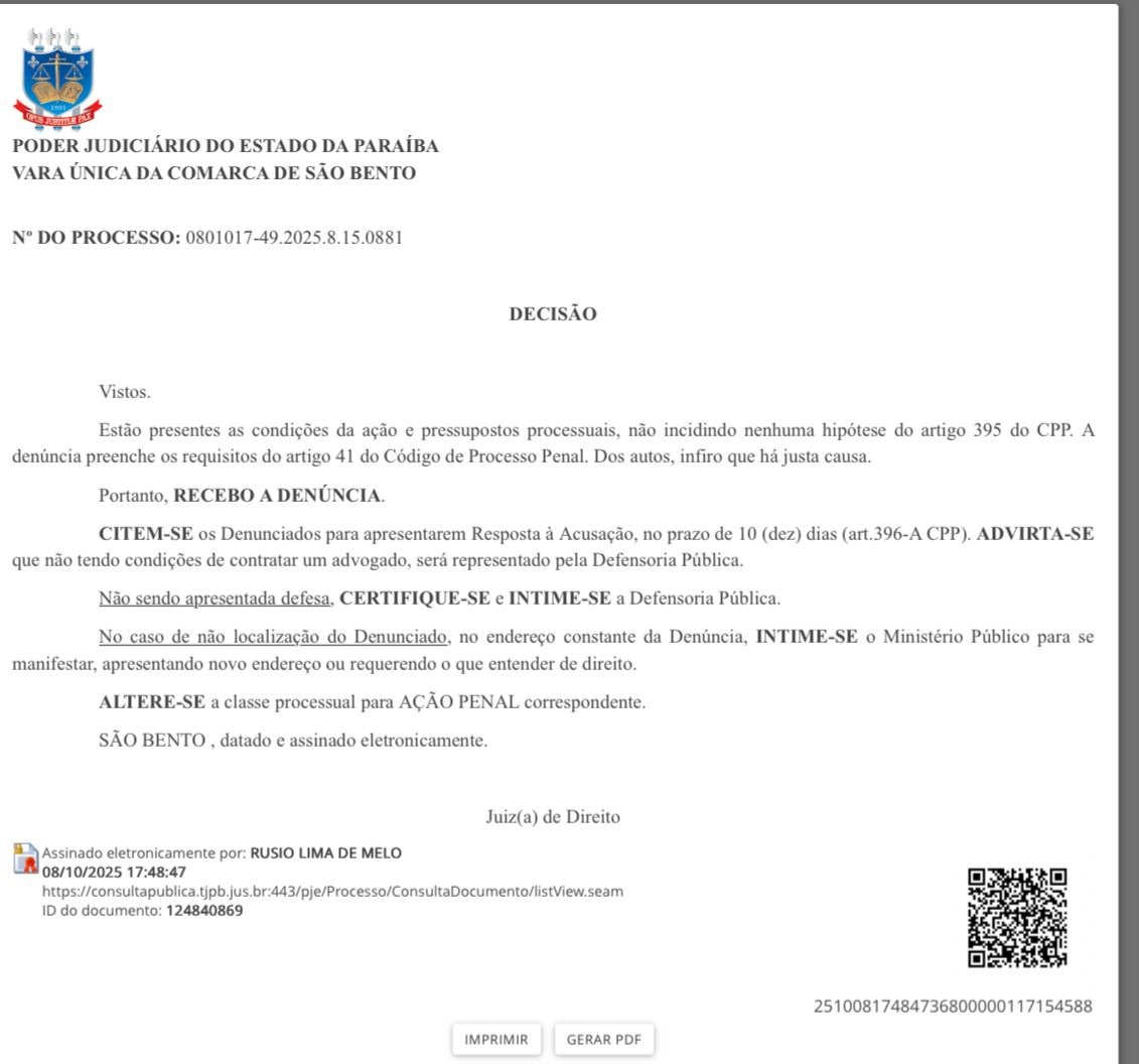 A decisão que formaliza a acusação partiu da Vara Única da Comarca de São Bento. Ao receber a denúncia (Ação Penal nº 0801017-49.2025.8.15.0881), o judiciário validou a existência de indícios robustos de autoria e materialidade, marcando o início oficial do processo criminal. Os réus foram devidamente citados para apresentar sua defesa.