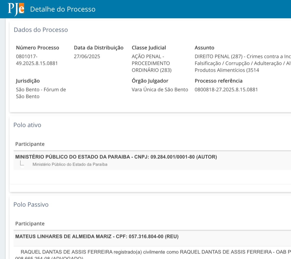 O cenário político e empresarial de Paulista, na Paraíba, foi abalado após a Justiça acatar a denúncia do Ministério Público (MPPB) e tornar o empresário e atual Vice-prefeito, Fernandes Freitas Monteiro, formalmente réu em uma Ação Penal. O político e mais três acusados enfrentarão o processo por supostos crimes contra a saúde pública, envolvendo a adulteração de alimentos e associação criminosa.