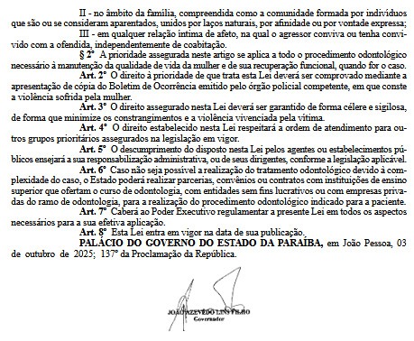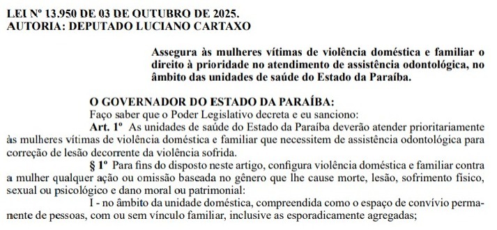 As mulheres vítimas de violência doméstica passam a ter, a partir deste sábado (4), prioridade no atendimento odontológico na Paraíba. A garantia consta na lei Nº 13.950/2025, de autoria do deputado Luciano Cartaxo (PT), e que foi sancionada pelo governador João Azevêdo (PSB). A lei foi publicada na edição de hoje (4) do Diário Oficial do Estado (DOE).