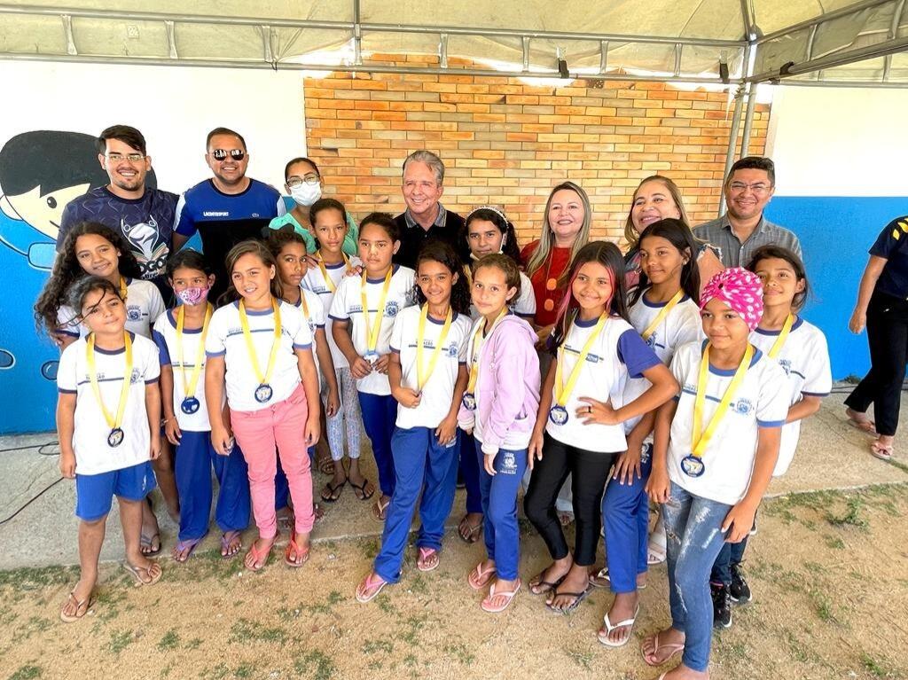 Na oportunidade, o prefeito realizou a entrega de medalhas às alunas campeãs no jogo esportivo matada, durante os Jogos Escolares do município.