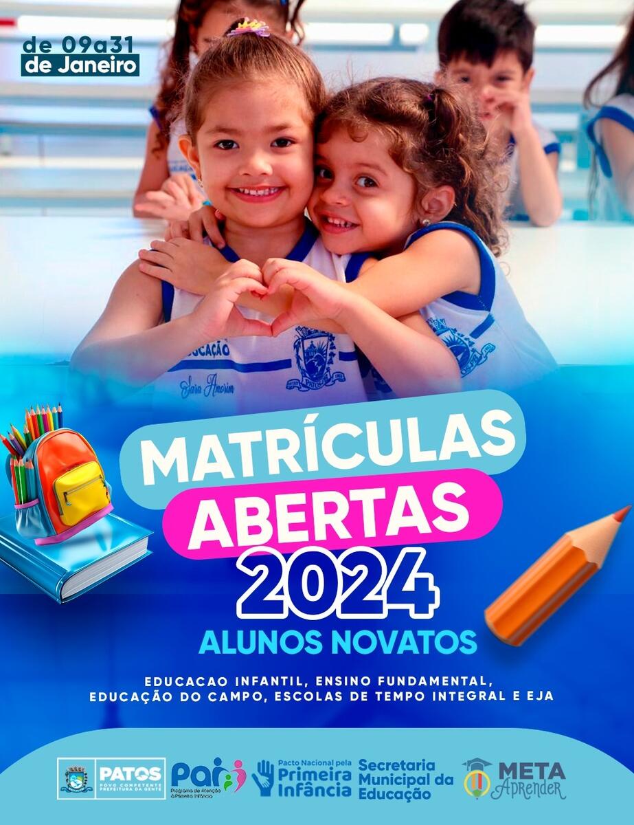 As matrículas para alunos novatos nas escolas municipais de Patos podem ser feitas entre os dias 9 e 31 de janeiro de 2024, presencialmente nas unidades escolares. Para a efetivação das matrículas, os pais ou responsáveis legais pelo aluno novato, ou o próprio aluno quando emancipado ou maior de 18 anos, precisam levar os seguintes documentos: