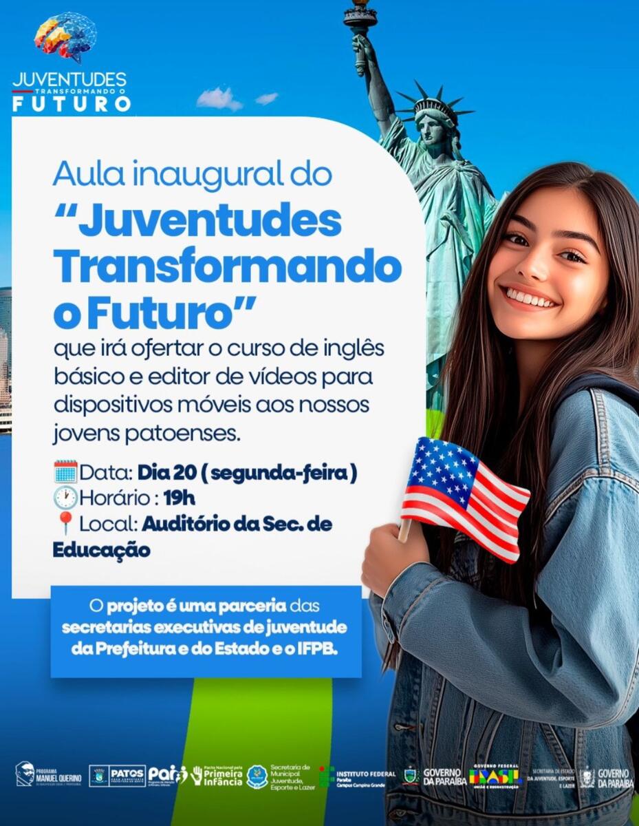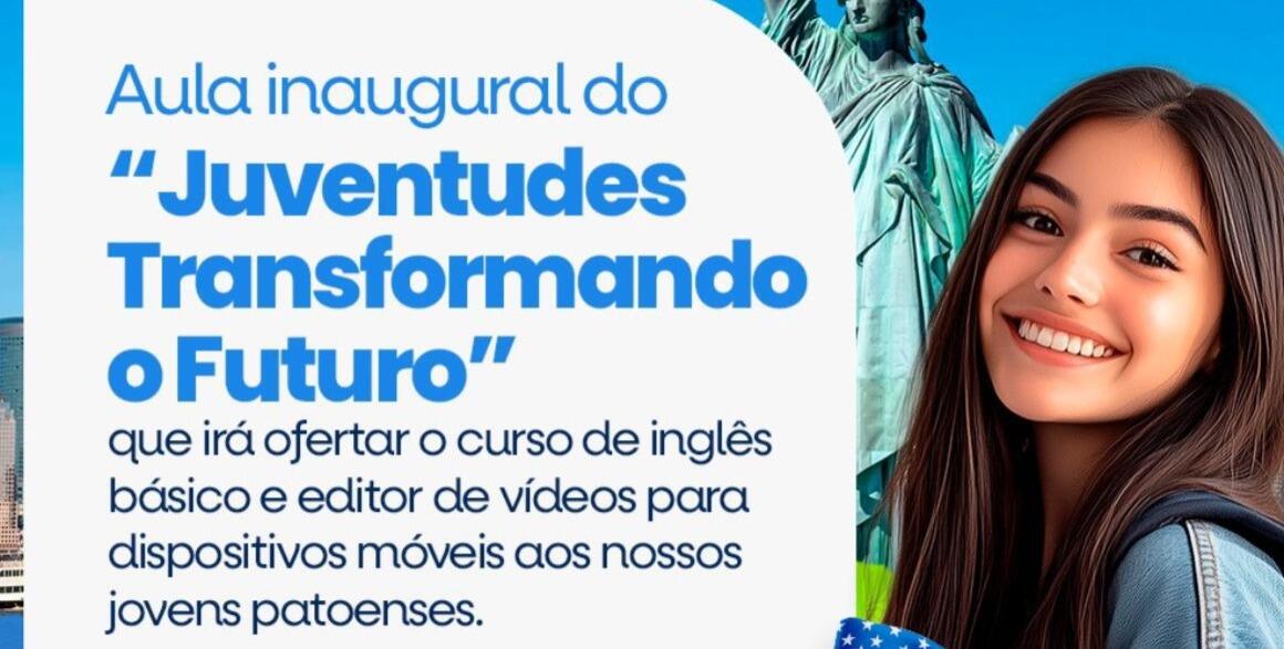 Nesta segunda-feira, 20 de janeiro, às 19h, o auditório da Secretaria Municipal de Educação será palco da aula inaugural do projeto “Juventudes Transformando o Futuro”. A iniciativa vai oferecer cursos gratuitos de inglês básico e edição de vídeos para dispositivos móveis, beneficiando 80 jovens patoenses.