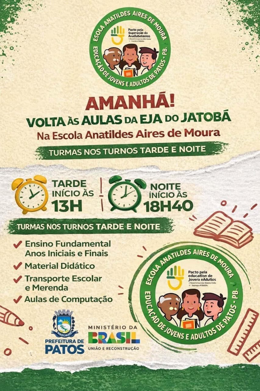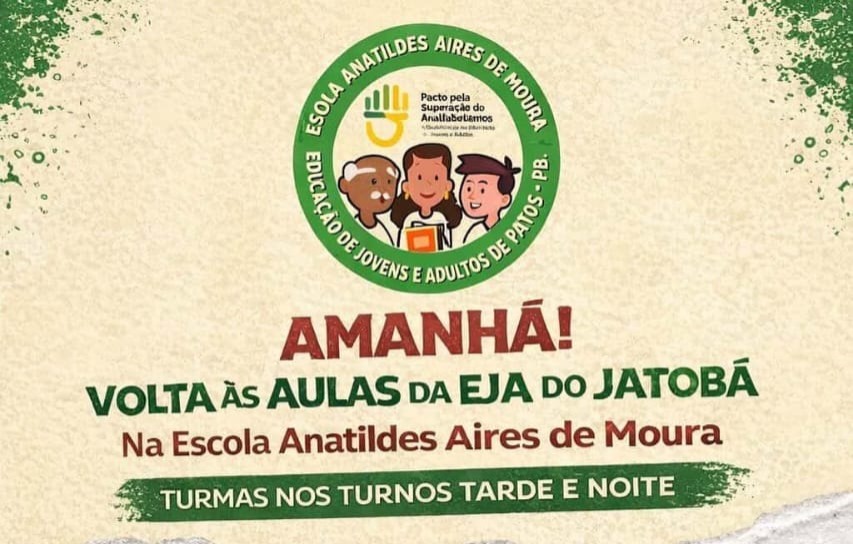 [13:34, 01/03/2026] Vicente Conserva: A Prefeitura Municipal de Patos, por meio da Secretaria Municipal de Educação de Patos, inicia nesta segunda-feira as aulas da Educação de Jovens e Adultos (EJA) no bairro Jatobá. As atividades serão realizadas na Escola Municipal Anatilides Aires de Moura, unidade exclusiva para a modalidade, organizada por ciclos e voltada a estudantes que desejam iniciar ou concluir o Ensino Fundamental.