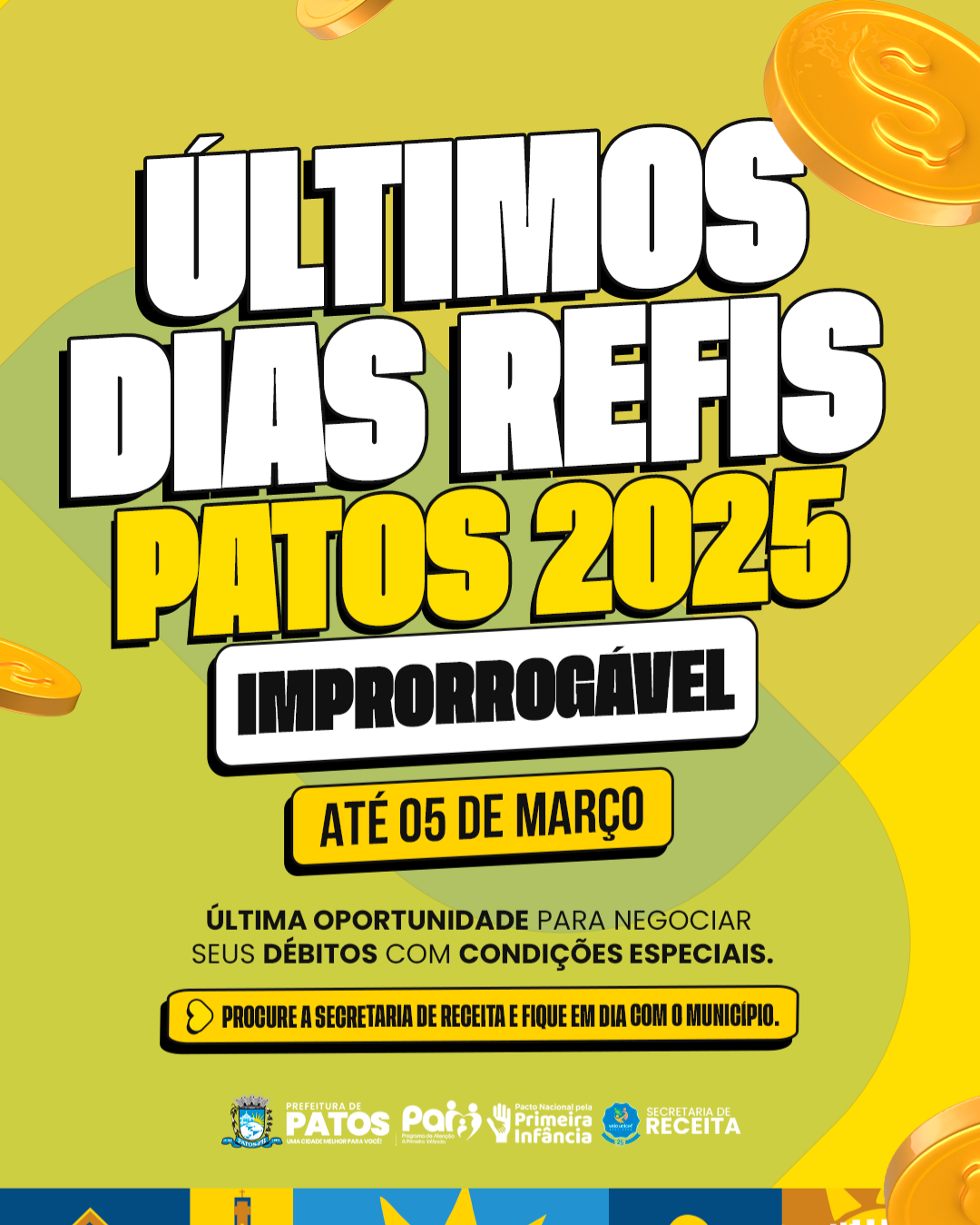 A Prefeitura de Patos, por meio da Secretaria de Receita, informa que esta é a semana decisiva para o encerramento do REFIS Patos. O prazo para adesão termina nesta quinta-feira, dia 5 de março, e não haverá prorrogação.