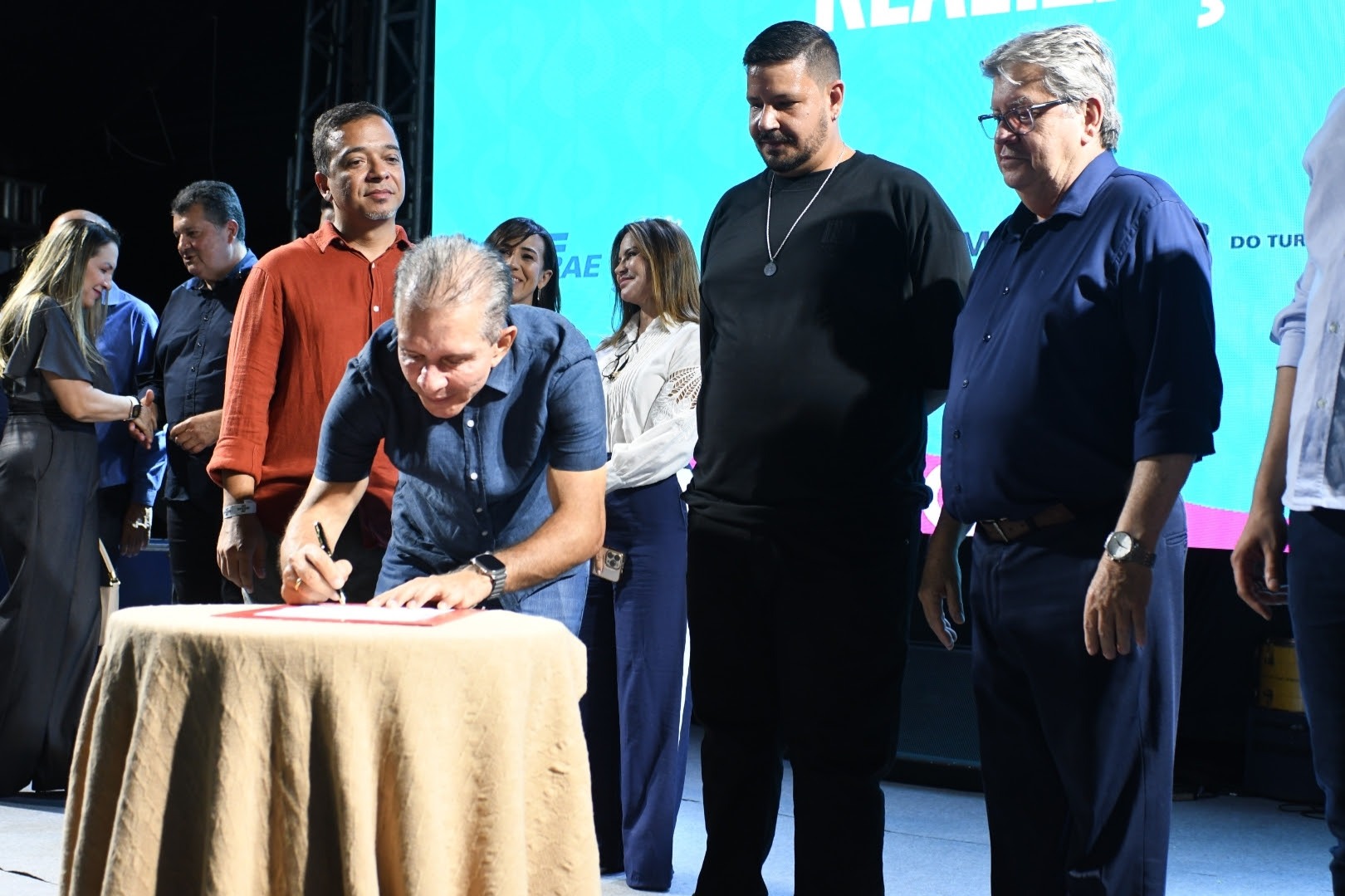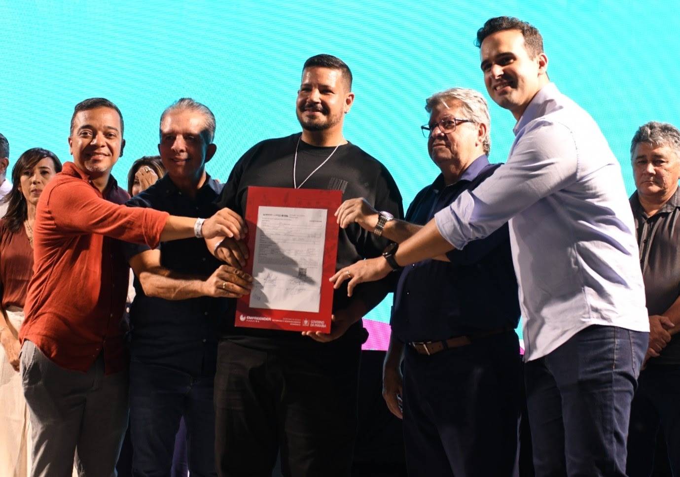 Logo em seguida, João Azevêdo homenageou empreendedores com cases de sucesso e assinou contratos no valor de R$ 78 mil para o município de Emas — Linhas Pessoa Física e Empreender Juventudes.