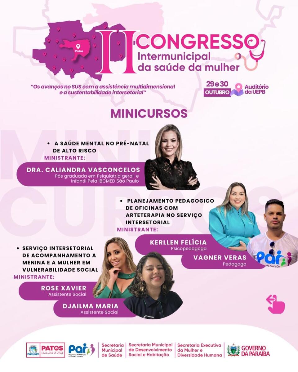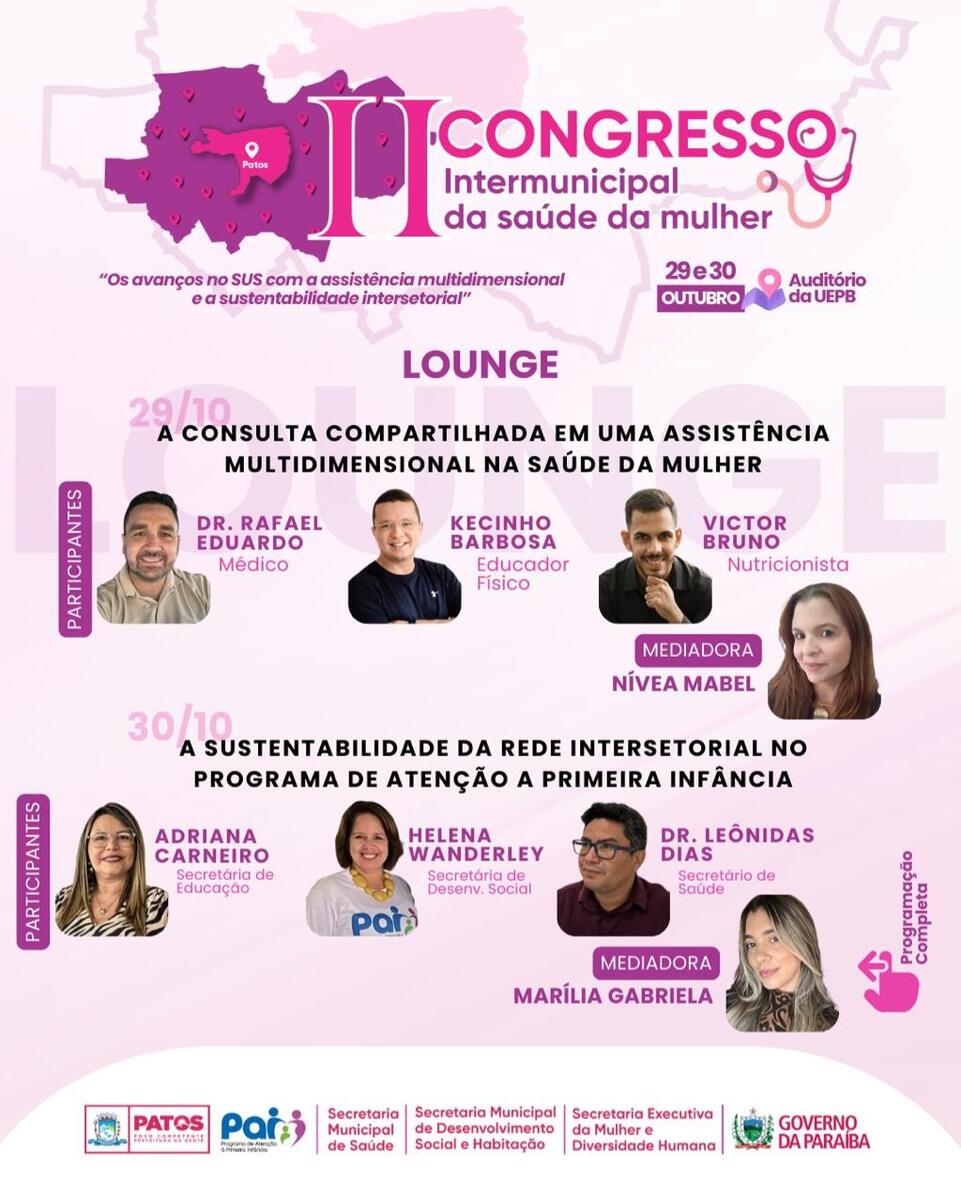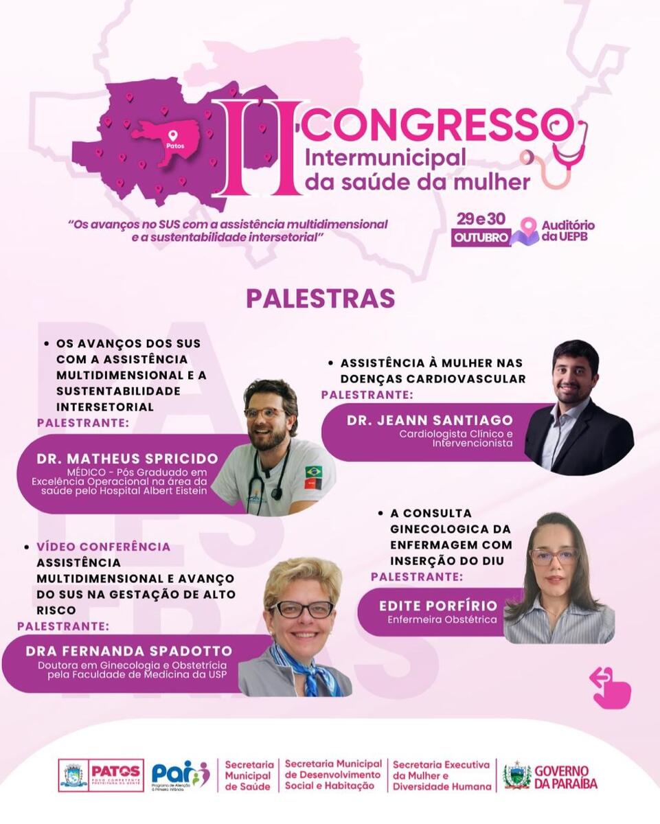 Nos dias 29 e 30 de outubro, a cidade de Patos sediará o II Congresso Intermunicipal de Saúde da Mulher, evento promovido pela Prefeitura de Patos, através da Secretaria Municipal de Saúde. O encontro será realizado no auditório da Universidade Estadual da Paraíba (UEPB) e trará palestras e minicursos voltados para profissionais da área de saúde.