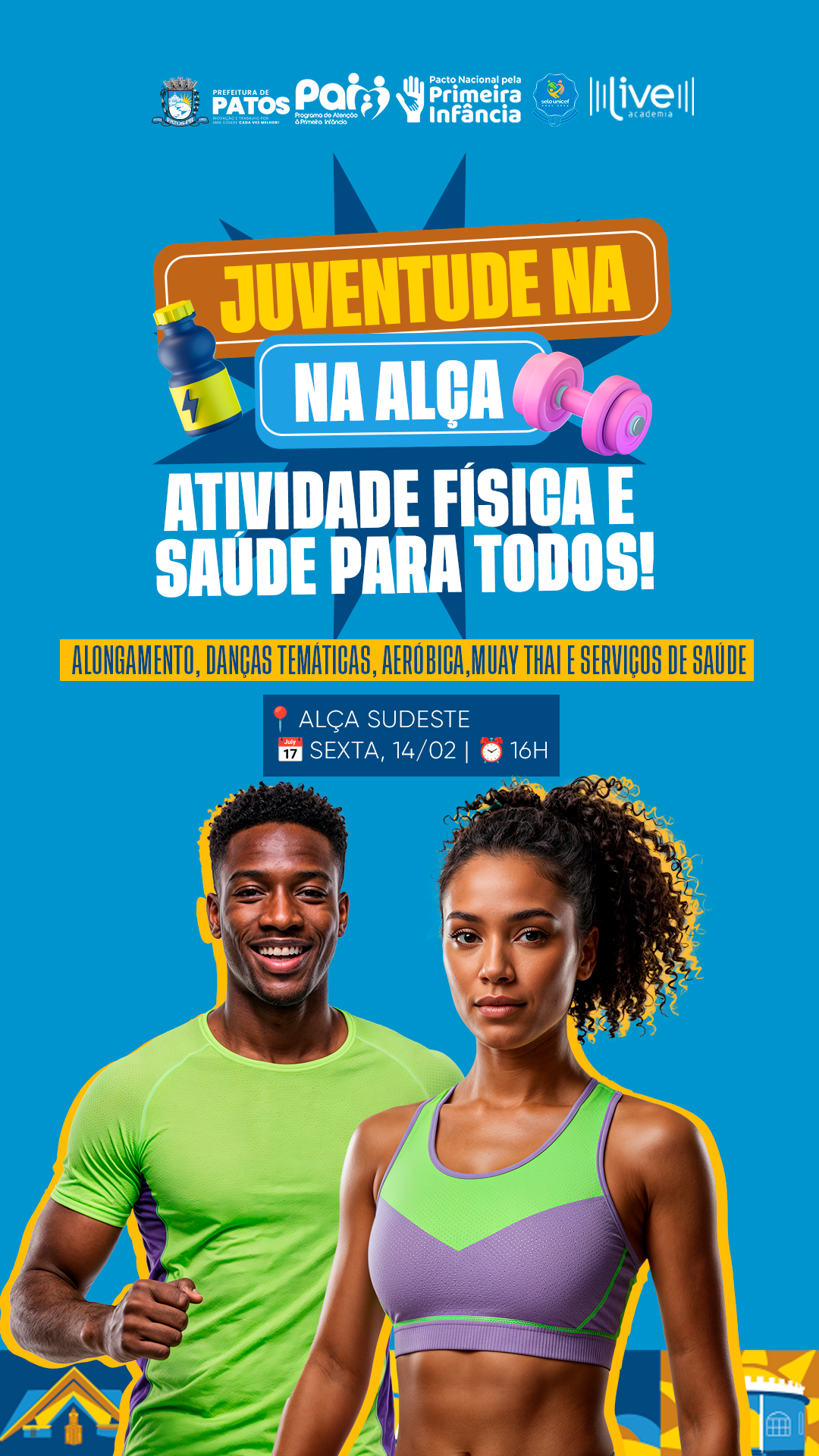A Prefeitura de Patos, por meio da Secretaria Executiva de Esporte e Lazer e da Secretaria Executiva de Juventude, dará início à nova temporada do Juventude na Alça na sexta-feira, 14 de fevereiro, a partir das 16h, na Alça Sudeste. O evento oferece atividades gratuitas para promover saúde e bem-estar, reunindo alongamento, danças temáticas, aeróbica e Muay Thai, além de serviços de saúde.