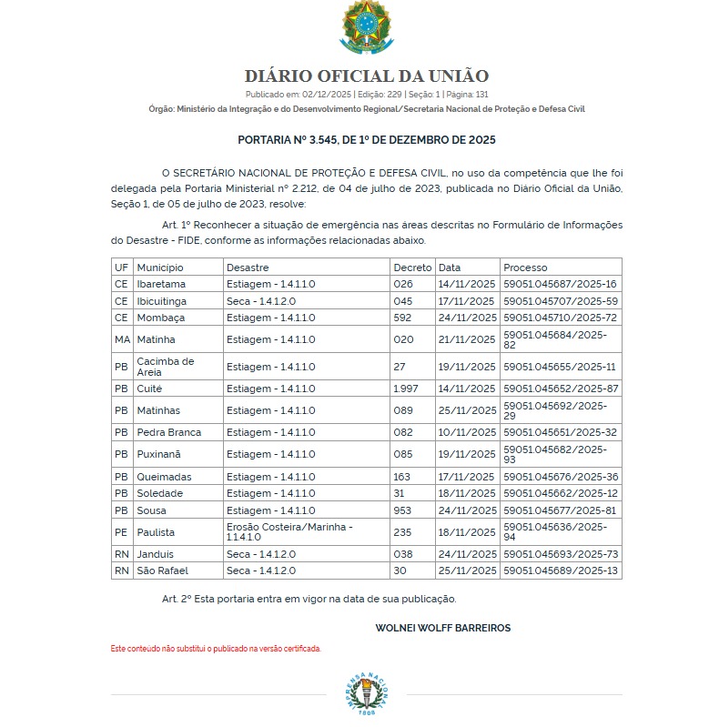 Secretaria Nacional de Proteção e Defesa Civil em decorrência da estiagem. Portaria foi publicada no Diário Oficial da União (DOU) desta terça-feira (2).