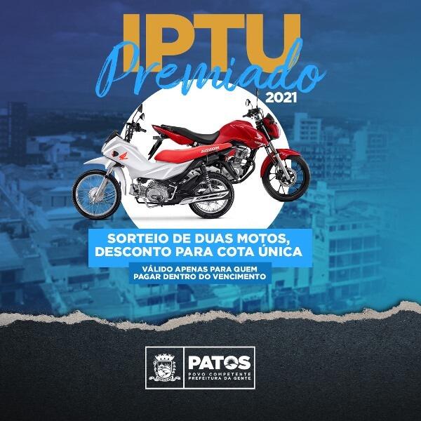 A Prefeitura de Patos reforça aos patoenses que está em vigência o calendário do IPTU premiado 2021, oportunidade que o contribuinte irá concorrer a sorteio de motocicletas.