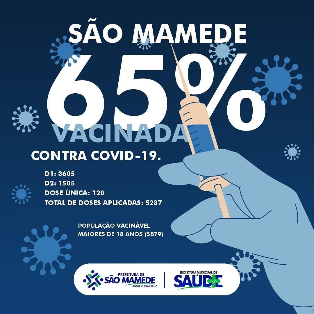 O município de São Mamede chega a 65% da população vacinada com a primeira dose contra a covid-19. Ao todo, segundo os dados de Secretaria de Saúde do município, São Mamede aplicou até este sábado (17) 5.237 doses ao todo, ou seja 3.604 para primeira dose e 1.505 para segunda dose e 120 dose única.