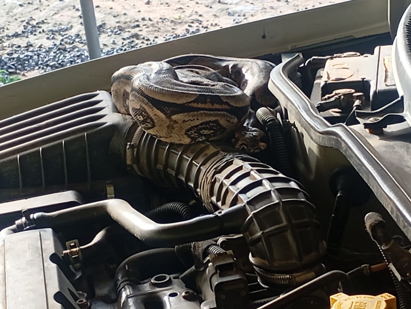 O pedreiro conhecido por todos por Ribeiro, teve uma surpresa ao abrir o capô do seu veículo que estava na garagem de casa Rua doutor Edivaldo Porfírio, no Monte Castelo, Zona Sul de Patos-PB. Ele encontrou uma cobra da espécie jiboia, de tamanho considerável, enrolada bem em cima do motor.