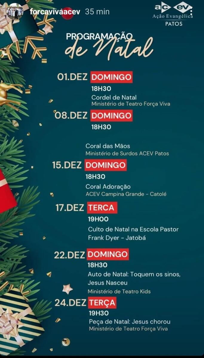 Com uma vasta programação, a Igreja Ação Evangélica de Patos-PB iniciou neste domingo (01), suas celebrações natalinas que durarão todo o mês de dezembro. Neste dia, um Cordel de Natal, apresentado pelo Ministério de Teatro Força Viva, abriu a série de cultos festivos de domingo.