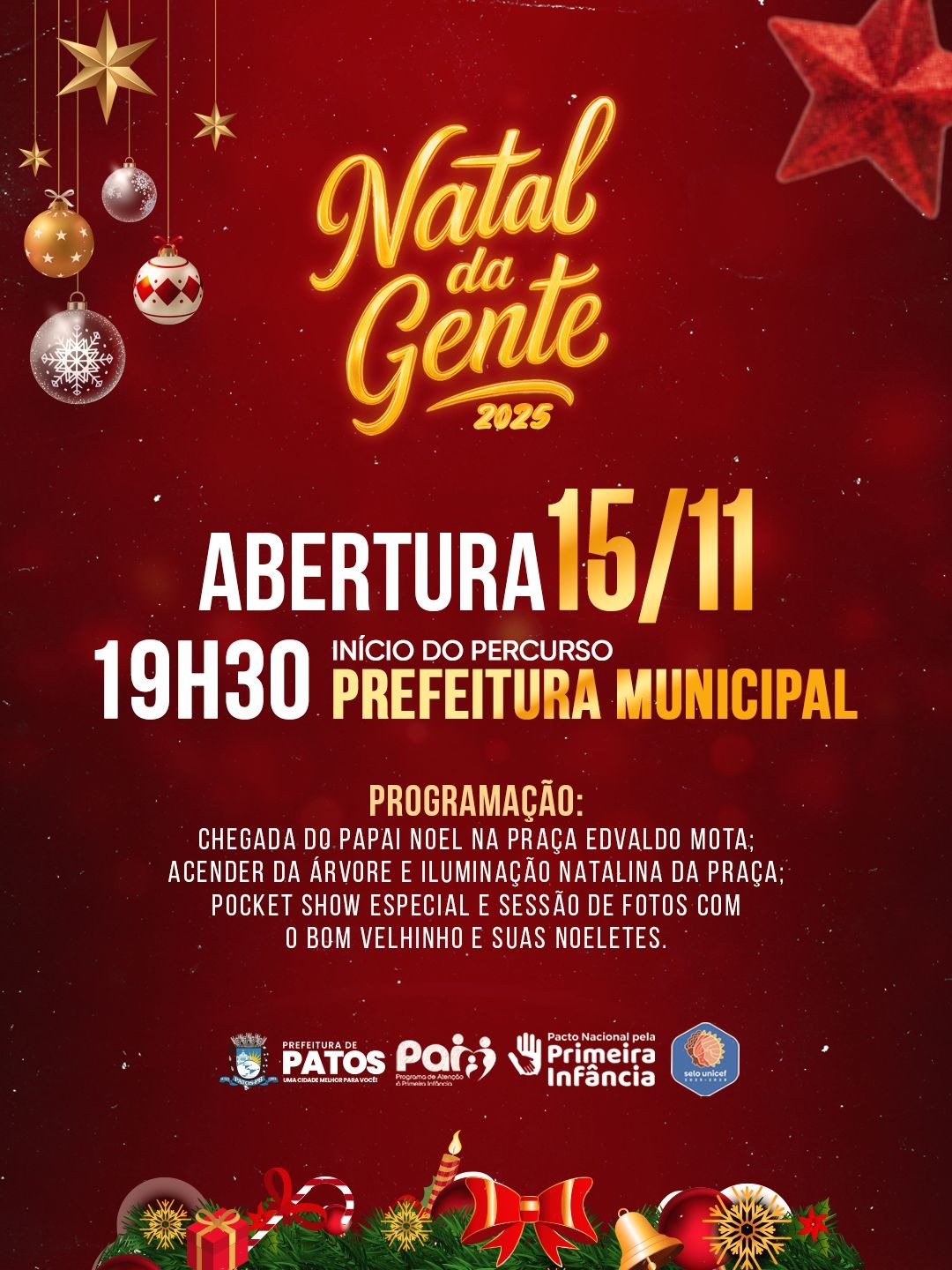 A Prefeitura de Patos realizará, neste sábado, 15 de novembro, a abertura oficial do Natal da Gente 2025, marcando o início das celebrações natalinas na cidade. O evento contará com o acendimento das luzes da árvore e da praça Edvaldo Mota, o tradicional desfile do Papai Noel e um pocket show natalino na Concha Acústica.