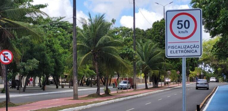 “Atenção. Velocidade máxima permitida. Equipamento em período educativo. 50 km/h”, diz um dos banners instalados ao lado da lombada eletrônica.
