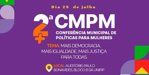 A cidade de Patos será palco, na próxima segunda-feira, dia 28 de julho, da II Conferência Municipal de Políticas Públicas para a Mulher, com o tema: “Mais democracia, mais igualdade, mais justiça para todas”. O evento, organizado pela Comissão organizadora municipal com apoio da Prefeitura de Patos, ocorrerá no auditório Paulo Bonavides, na UNIFIP, das 13h às 18h.