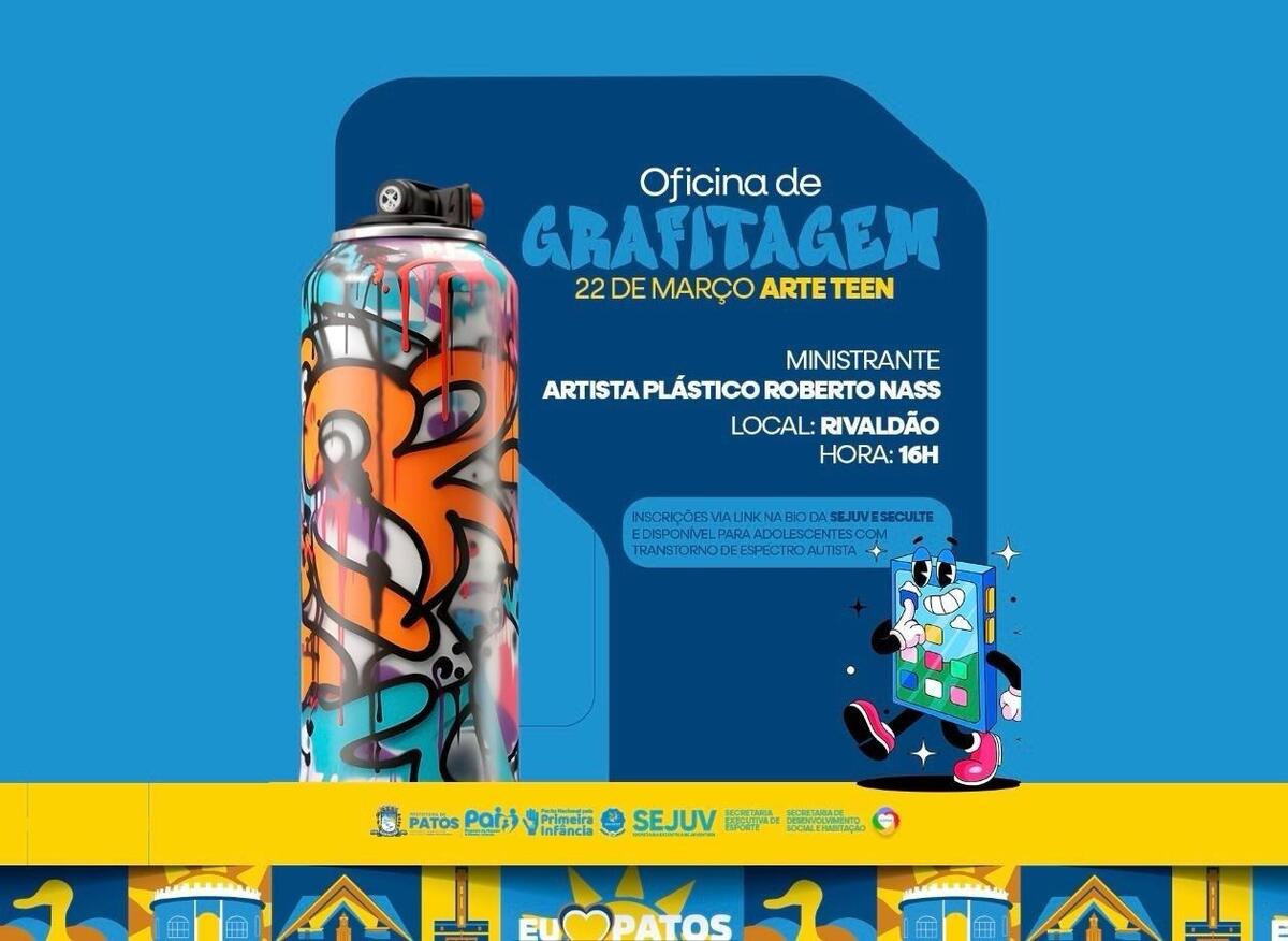 Promovida pela Prefeitura de Patos, por meio da Secretaria Executiva de Juventude (SEJUV), da Secretaria de Cultura, Turismo e Esportes (SECULTE) e da Secretaria de Desenvolvimento Social, a oficina acontecerá no dia 22 de março, no Ginásio O Rivaldão, a partir das 16h. Os participantes terão a oportunidade de aprender sobre a arte da grafitagem com o renomado artista plástico e ilustrador Roberto Nass.