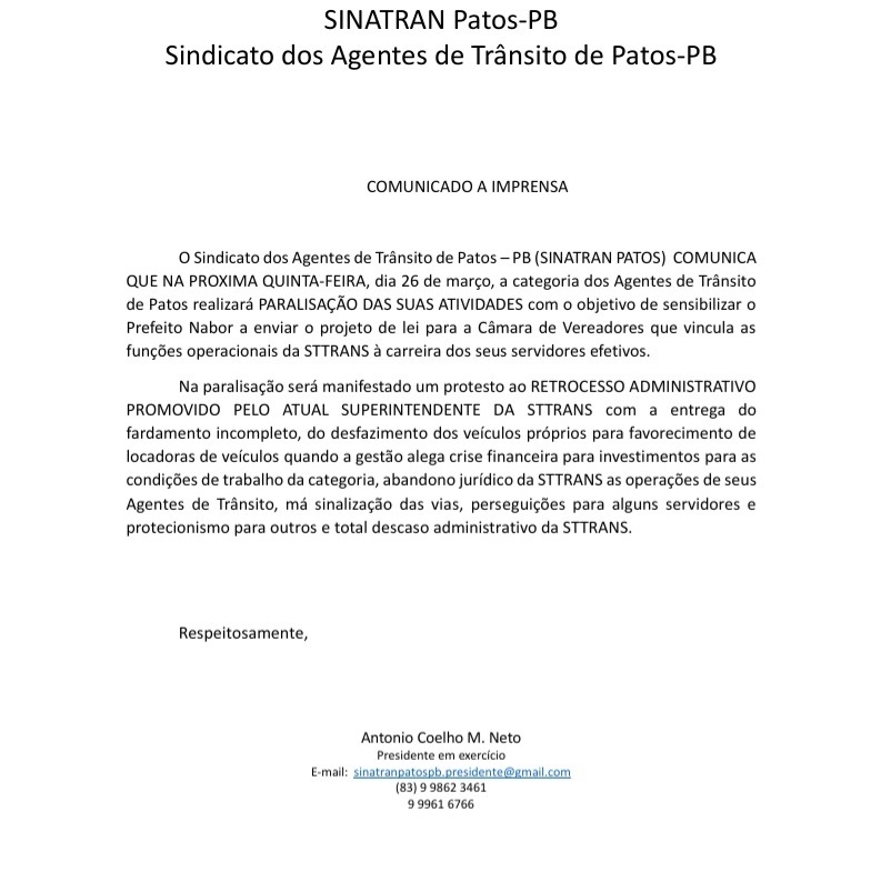 O Sindicato dos Agentes de Trânsito de Patos – PB (SINATRAN PATOS) está nunciado para próxima quinta-feira, dia 26 de março, uma paralização da categoria com o objetivo de sensibilizar o prefeito Nabor Wanderley a enviar o projeto de lei para a Câmara de Vereadores que vincula as funções operacionais da STTRANS à carreira dos seus servidores efetivos.