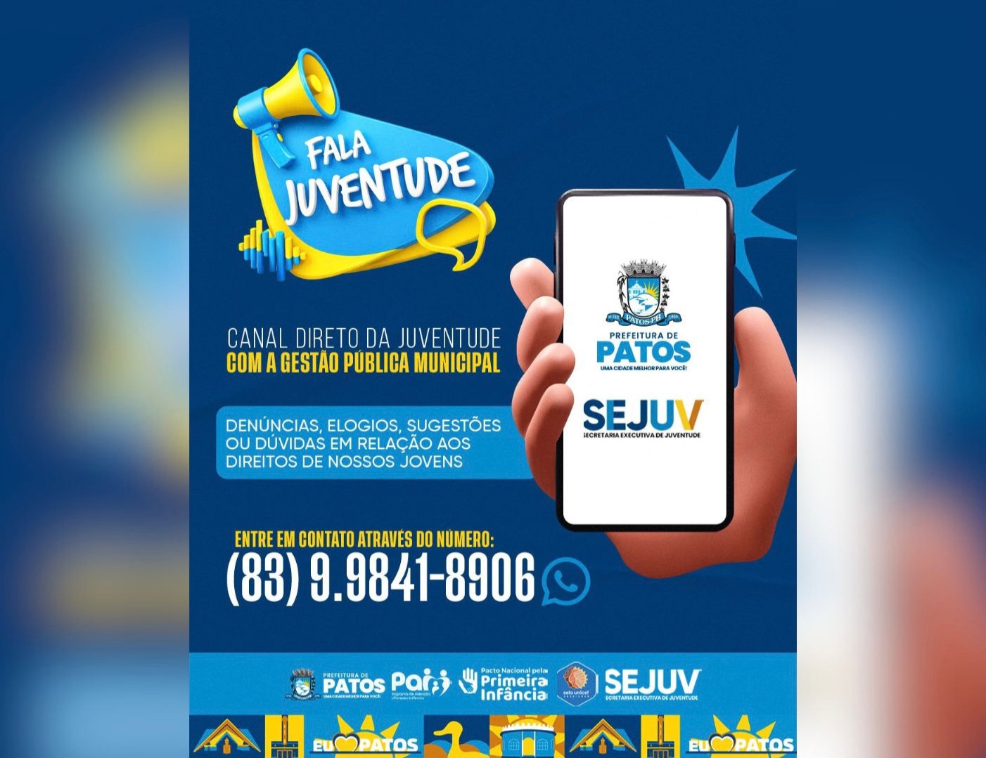 O Fala Juventude já está em funcionamento e pode ser acessado pelo número (83) 99841-8906, canal que ficará permanentemente à disposição para o envio de mensagens, sugestões e demandas.