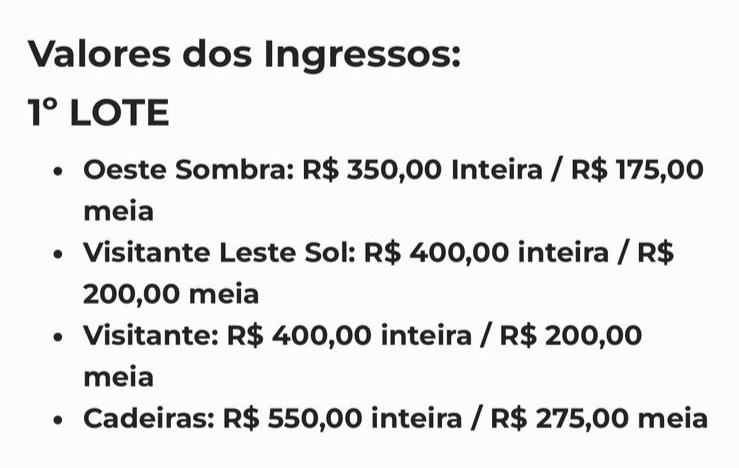 De acordo com os valores divulgados nesta quinta-feira (17), o ingresso mais barato da partida custa R$ 300 (inteira, setor Sombra), enquanto o valor mais alto — para o setor de cadeiras — chega a R$ 500. Já os torcedores visitantes, que ficarão no setor Sol, terão que desembolsar R$ 400. Meia-entrada será aplicada conforme a legislação.