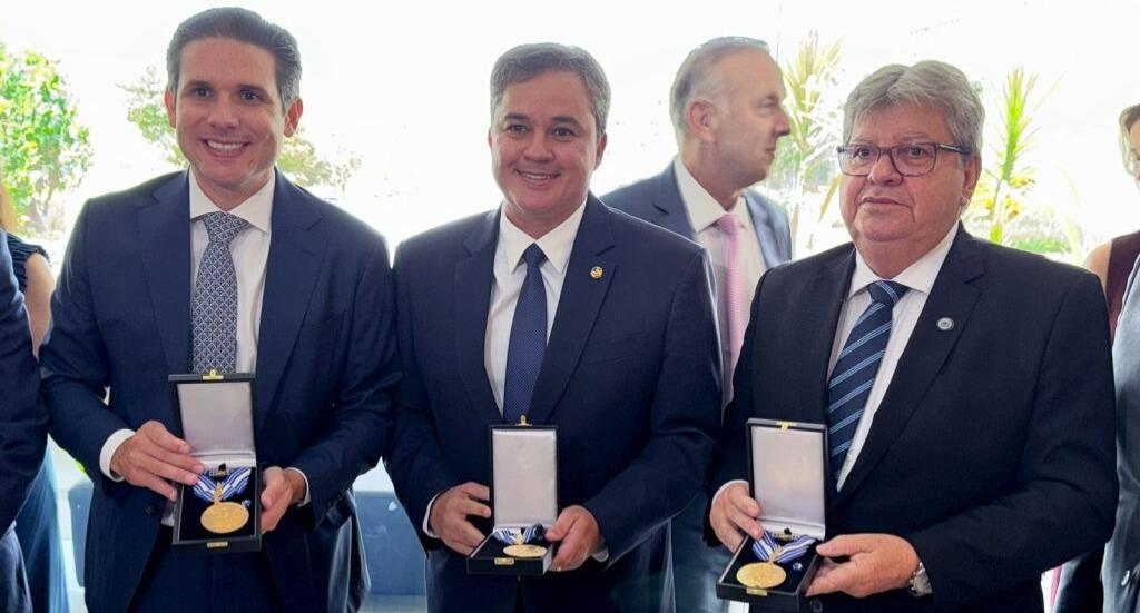 O governador João Azevêdo (PSB), o senador Efraim Filho (União Brasil) e o presidente da Câmara dos Deputados, Hugo Motta (Republicanos), foram homenageados nesta quarta-feira (9) com a Medalha Mérito Comercial Corálio Oliveira, concedida pelo Sistema Fecomércio-PB. A cerimônia ocorreu durante um almoço no restaurante do Sesc na Câmara dos Deputados, em Brasília.