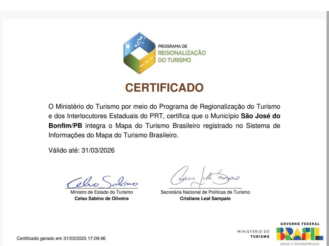 Este certificado é um aval do Ministério do Turismo que permite a transferência de recursos oriundos do poder executivo para financiar projetos e eventos no âmbito do território de São José do Bonfim.