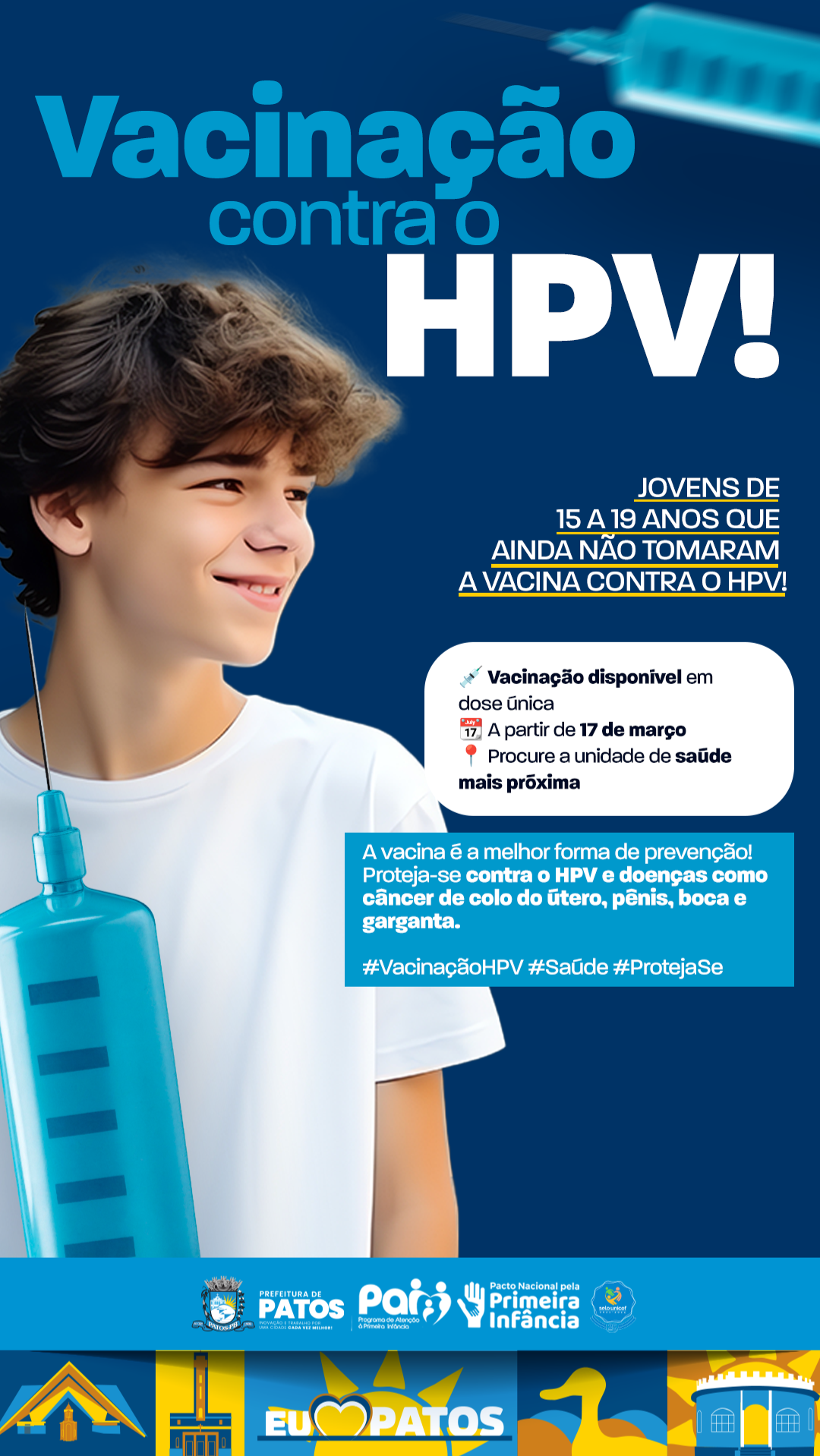 A Prefeitura de Patos, por meio da Secretaria de Saúde e setor de imunização, inicia na próxima segunda-feira, 17 de março, a intensificação da vacinação contra o HPV (Papilomavírus Humano), voltada para adolescentes e jovens de 15 a 19 anos que ainda não tomaram a vacina.