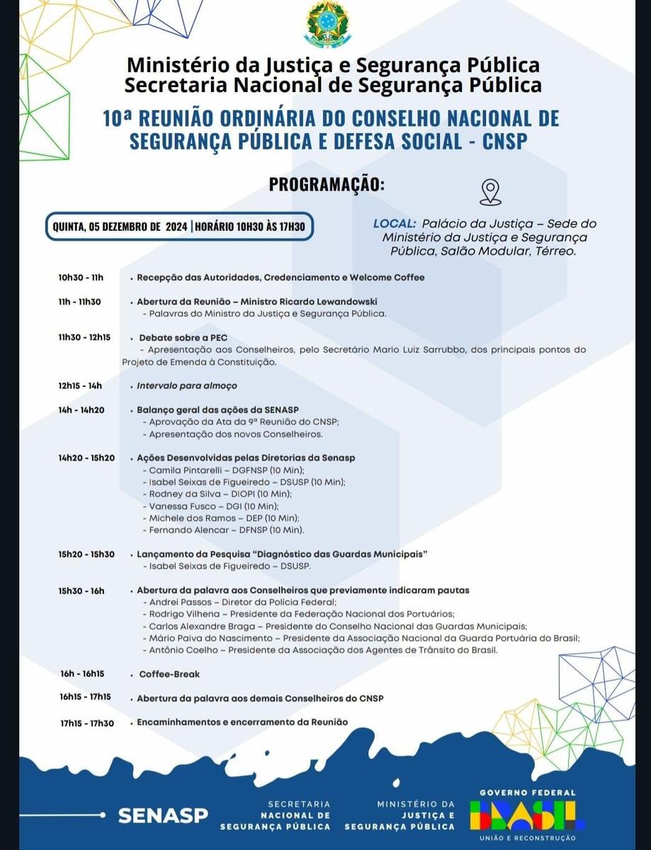 Nesta próxima quinta-feira, dia 05 de dezembro, será realizada a 10° Reunião Ordinária do Conselho Nacional de Segurança Pública - CNSP, em Brasília-DF.