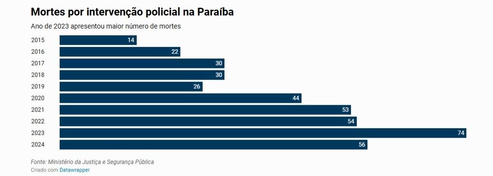 Os números são altos, mas a nível de Nordeste, a Paraíba fica bem posicionada. Em 2024, o estado é o segundo que menos mata em intervenções policiais, ficando a frente apenas do Piauí. O estado da Bahia segue no topo do ranking com larga distância: no ano passado, foram registradas 1.557 mortes por intervenção policial.