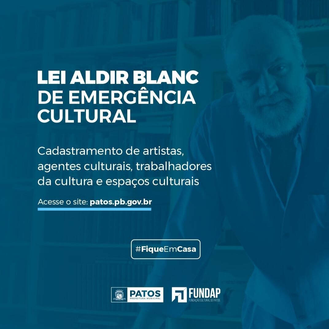 A Prefeitura Municipal de Patos por meio da Fundação Cultural (Fundap), faz chamamento público para cadastro de artistas, grupos, bandas, coletivos culturais, profissionais de arte e cultura e trabalhadores da cultura em geral, que estejam aptos a receber o auxílio de três parcelas no valor de R$ 600,00, previstos na Lei Aldir Blanc.