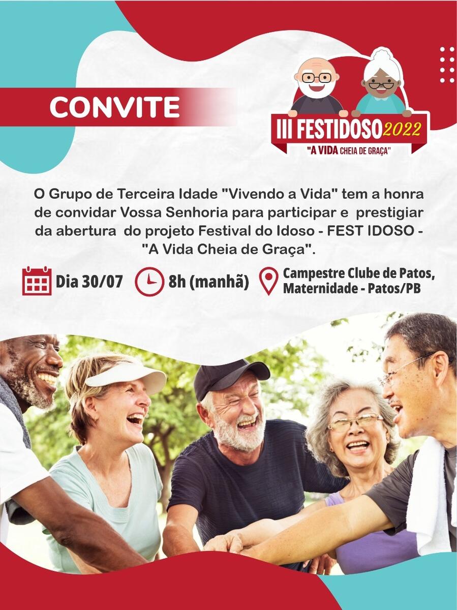 O último evento aconteceu em 2019 no Ginásio do Sesi. O Fest Idoso tem ganhado muitos adeptos, pois se trata de um evento totalmente inclusivo, elaborado para o público da melhor idade. As atividades para os idosos voltam com força total. O evento reunirá 13 municípios que fazem parte da região de Patos, sendo realizado no Campestre Clube, no próximo dia 30 de Julho.