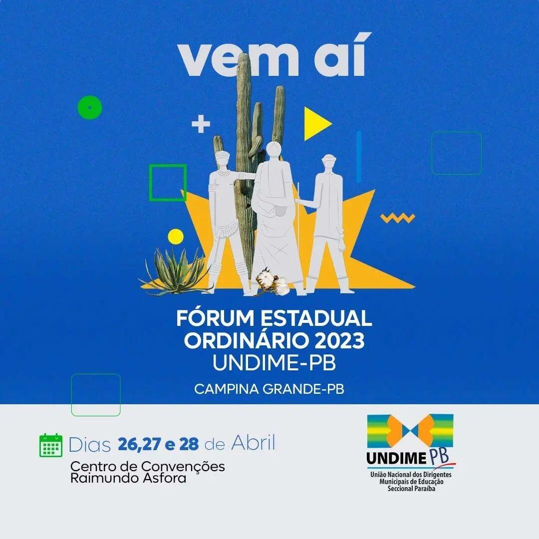 Nos dias 26 a 28 de abril deste ano acontecerá no Centro de Convenções Raimundo Asfora, em Campina Grande, o Fórum Estadual Ordinário da União Nacional dos Dirigentes Municipais de Educação (UNDIME) Seccional Paraíba, reunindo dirigentes educacionais dos municípios paraibanos em torno discussões e troca de experiências no âmbito da educação.