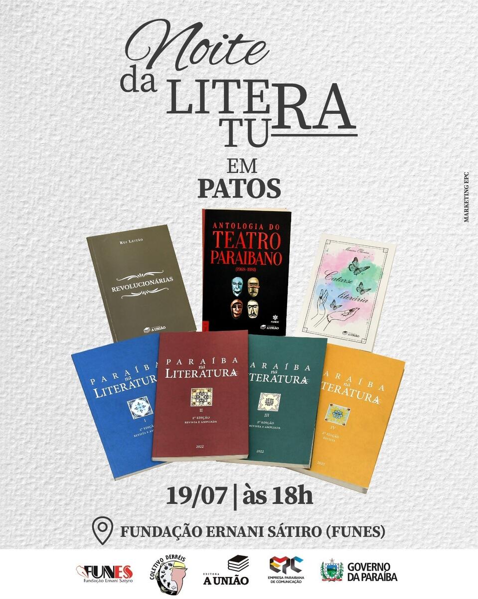 A cidade de Patos, no Sertão do Estado, recebe nesta quarta-feira (19), às 18h, na Fundação Ernani Sátiro (Funes), o projeto ‘Noite da Literatura Paraibana’, que vai contar com lançamentos de livros e apresentações culturais. A realização é da Empresa Paraibana de Comunicação (EPC), por meio da Editora A União, em parceria com o Coletivo Cultural Derréis e a Funes.