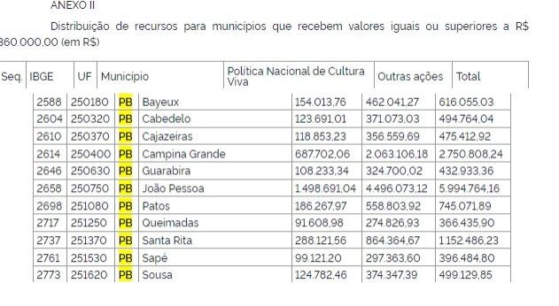 A Paraíba vai receber R$ 72 milhões, somando recursos para o Estado e municípios, para a construção de Centros da Cultura (CEUs) e fomentar outras ações voltadas à cultura. Os recursos foram garantidos através de uma portaria publicada pelo Ministério da Cultura.